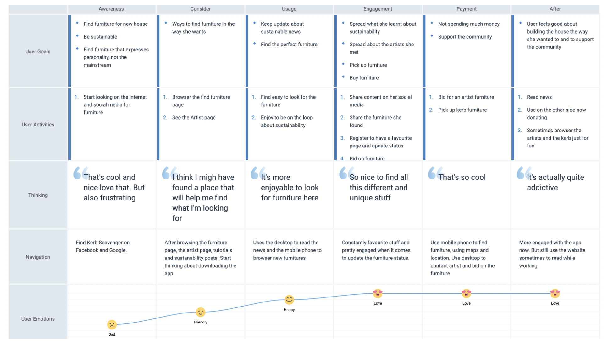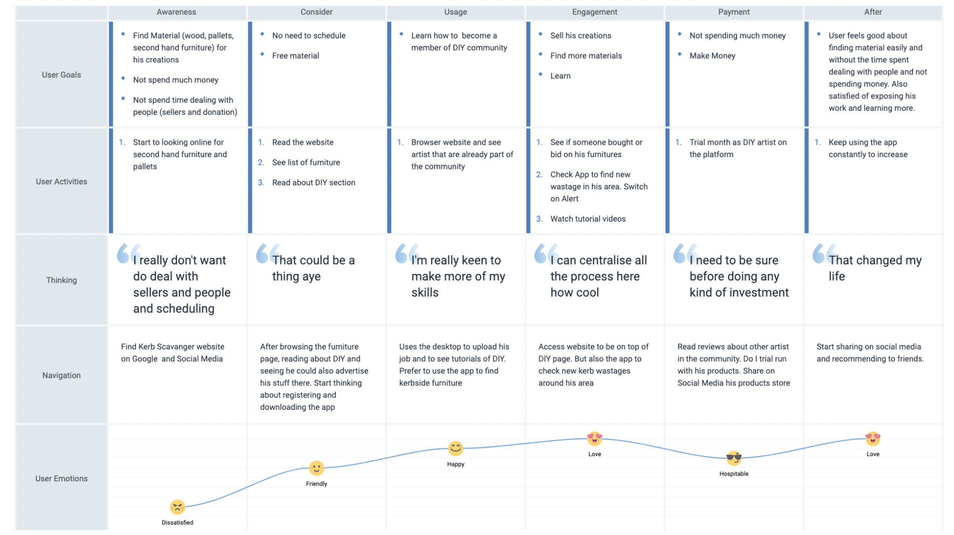 And then created a basic journey map to visualise the process the personas go through to accomplish a goal. It started by compiling a series of user actions into a timeline. Next, the timeline was flashed with user thoughts and emotions to create a narrative.